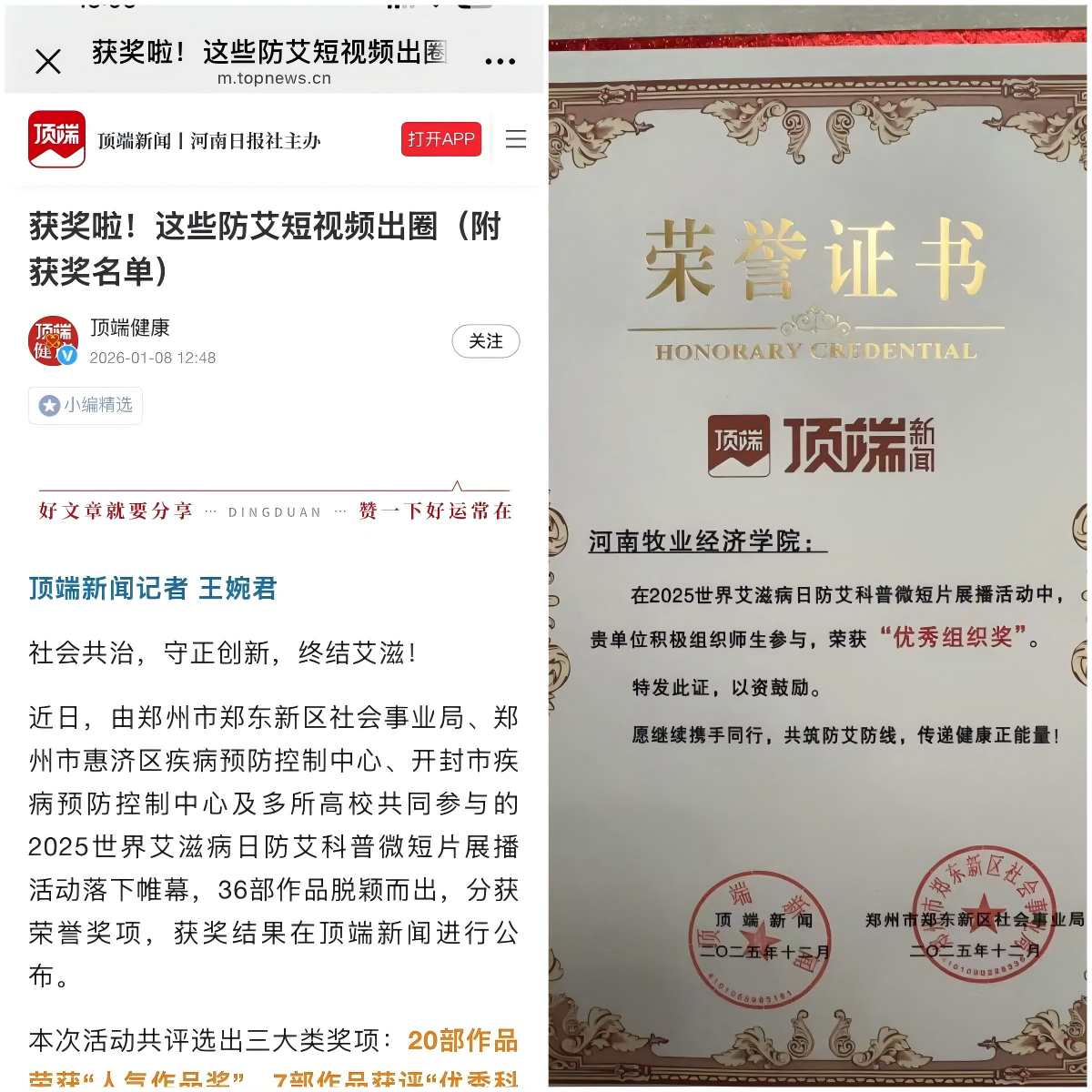 近日,由河南日报社、顶端新闻主办,多地疾控部门与高校共同参与的2025世界艾滋病日防艾科普微短片展播活动落下帷幕。我校凭借高效组织与优质创作脱颖而出,斩获集体与个人8项荣誉。